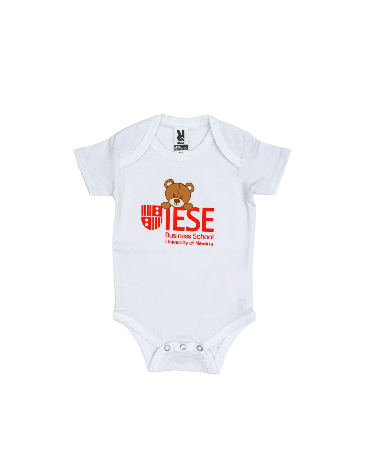 Short sleeve bodysuit, single jersey. Crew neck and 1×1 round ribbed edge. Closures with snaps buttons in the crotch. Crossed shoulder opening.