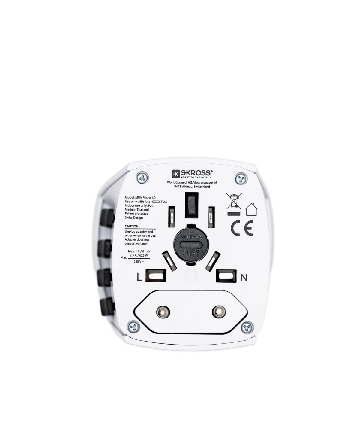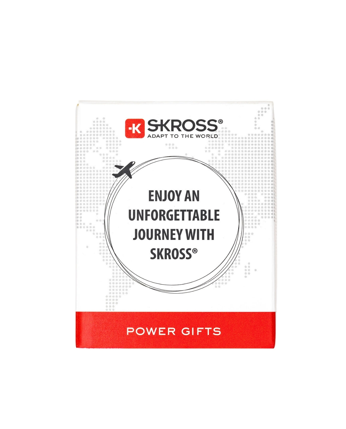 Universal SKROSS® travel adapter. Receptacles for Europe, USA/Japan, Australia/China. 2-pole, unearthed. Fulfils all international security-relevant standards and norms. Even child safe.